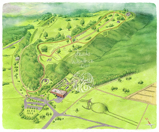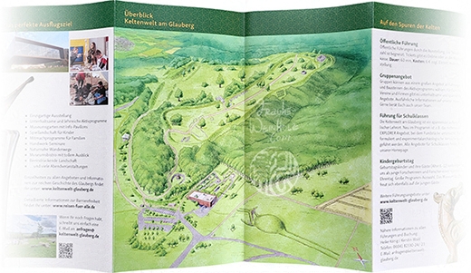 Illustration der weiteren Umgebung des hessischen Museums Keltenwelt am Glauberg inklusive Glaubergplateau und Wanderwege. Darunter die Karte in der der Anwendung auf einem Flyer. | Illustration of the extended surroundings of the hessian museum Keltenwelt am Glauberg, including the Glauberg plateau and hiking trails. Below: the final flyer with the illustration. |