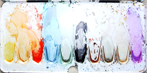 Nehmt die Farbe nicht direkt aus dem Farbnäpfchen auf. So kann man schlecht kontrollieren, wieviel Farbe auf dem Pinsel ist, und auf dem Papier hat man dann vielleicht eine ungewollt kräftige Farbfläche. Nutzt die Palette, die an vielen Kästen schon angebracht ist, kauft euch eine kleine Extrapalette oder nehmt einfach einen weißen Teller. Darauf verfrachtet ihr dann die mit Wasser gelöste Farbe aus den Näpfchen und könnt die gewünschte Farbmenge dann aufs Papier bringen, indem ihr evtl mit Extrawasser die Farbe in den leeren Bereich der Palette schiebt und dabei genau seht, wie konzentriert die Farbe ist. ![]() Wenn ihr für heute genug gezeichnet habt, braucht ihr die Palette nicht sauber zu machen. Da die Farbe ja wasserlöslich ist, könnt ihr sie beim nächsten mal weiterbenutzen. Es reicht schon, wenn man den Kasten alle halbe Jahre mal gründlich von Farbresten und Staub befreit ;) |